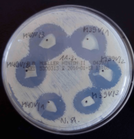 Here, a petri dish is inoculated with MRSA germs and some collagen fleeces made by us with Maresomes are distributed on this. So it can be seen that the dressing prevents the colonization of MRSA germs. There are no MRSA germs around the fleece.